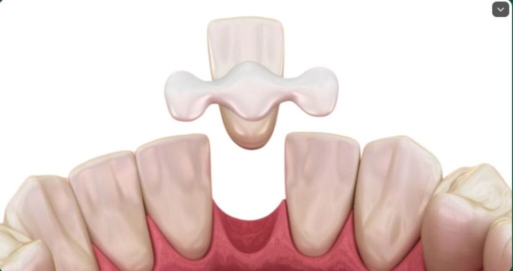 This bridge is bonded to the back of a neighbouring tooth, with minimal or no drilling